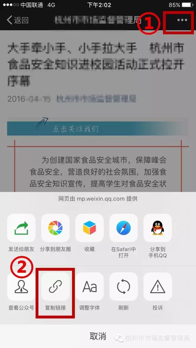 (3)在手机上进入文章,点击下图右上角①处。然后点击下图②处复制链接即可