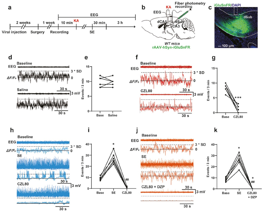 该研究首先建立了经典的小鼠海人藻酸(KA)诱导的SE模型,发现CZL80对SE的治疗潜力,同时显著降低了死亡率。利用联合给药的模式进一步发现CZL80能终止地西泮耐药性SE,并将治疗时间窗延长至3小时,且对SE引起的神经元损伤具有一定的保护作用,为耐药性SE的临床治疗提供了良好的研究基础。