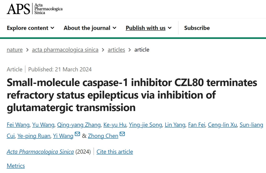 近期,公司陈忠教授及汪仪研究员团队在Acta Pharmacologica Sinica在线发表了题为“Small-molecule caspase-1 inhibitor CZL80 terminates refractory status epilepticus via inhibition of glutamatergic transmission”的研究论文,首次揭示了课题组前期发现的新型特异性Caspase-1小分子抑制CZL80具有治疗耐药新癫痫持续状态(SE)的作用,并揭示其通过逆转神经炎症介导的兴奋性谷氨酸能突触传递增加而发挥疗效机制。该研究为Caspase-1参与耐药性SE的发病机制提供了实验基础,并为耐药性SE的临床治疗提供潜在药物靶点和新型化合物。