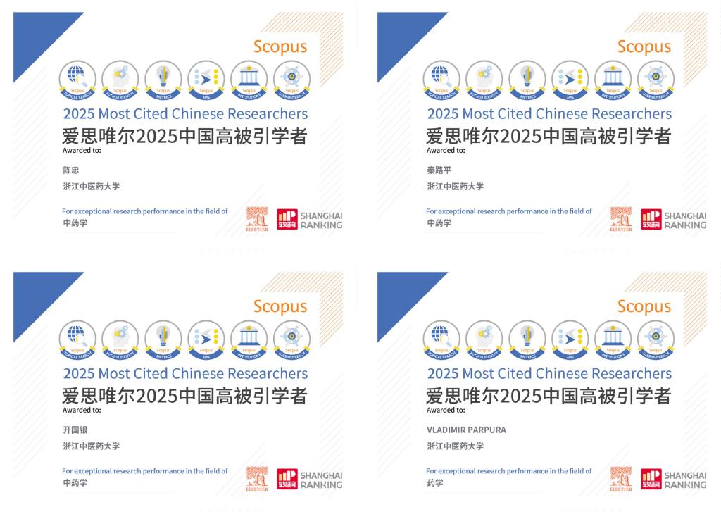 2026年1月30日,爱思唯尔(Elsevier)正式发布2025年度“中国高被引学者”(Highly Cited Chinese Researchers)榜单。公司共有4位学者入选,全部来自必一运动,其中,中药学领域3位(陈忠教授、秦路平教授、开国银教授),药学领域1位(Vladimir Parpura教授)。4位教授的再次入选,充分彰显了公司学者在药学和中药学领域的核心学术影响力。