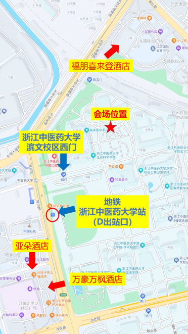 地铁(推荐):在杭州东站乘坐地铁4号线(浦沿方向)到“中医药大学站”下车(D出口),步行660米到达会场,全程约42分钟(票价5元)。