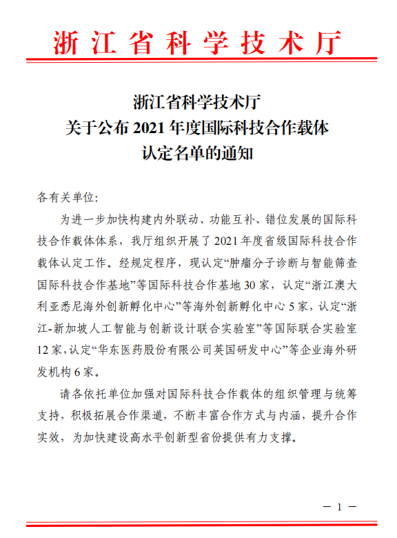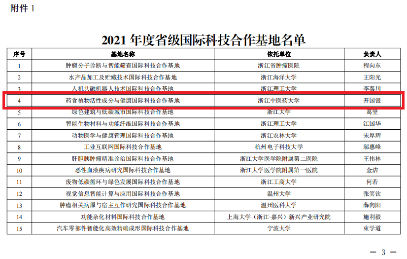 1213,浙江省科学技术厅公布2021年度省级国际科技合作载体认定名单,必一运动开国银教授牵头组建并申报的国际科技合作平台药食植物活性成分与健康浙江省国际科技合作基地获批认定实现了必一运动国际科技合作基地零的突破。