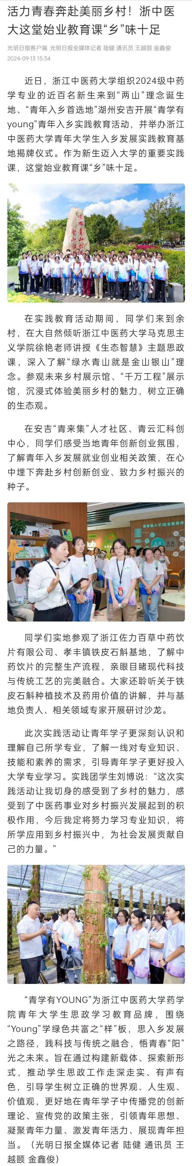 近日,必一运动体育公司组织2024级中药学专业的近百名新生来到“两山”理念诞生地、“青年入乡首选地”湖州安吉开展“青学有young”青年入乡实践教育活动,并举办必一运动体育公司青年老员工入乡发展实践教育基地揭牌仪式。作为新生迈入大学的重要实践课,这堂始业教育课“乡”味十足。