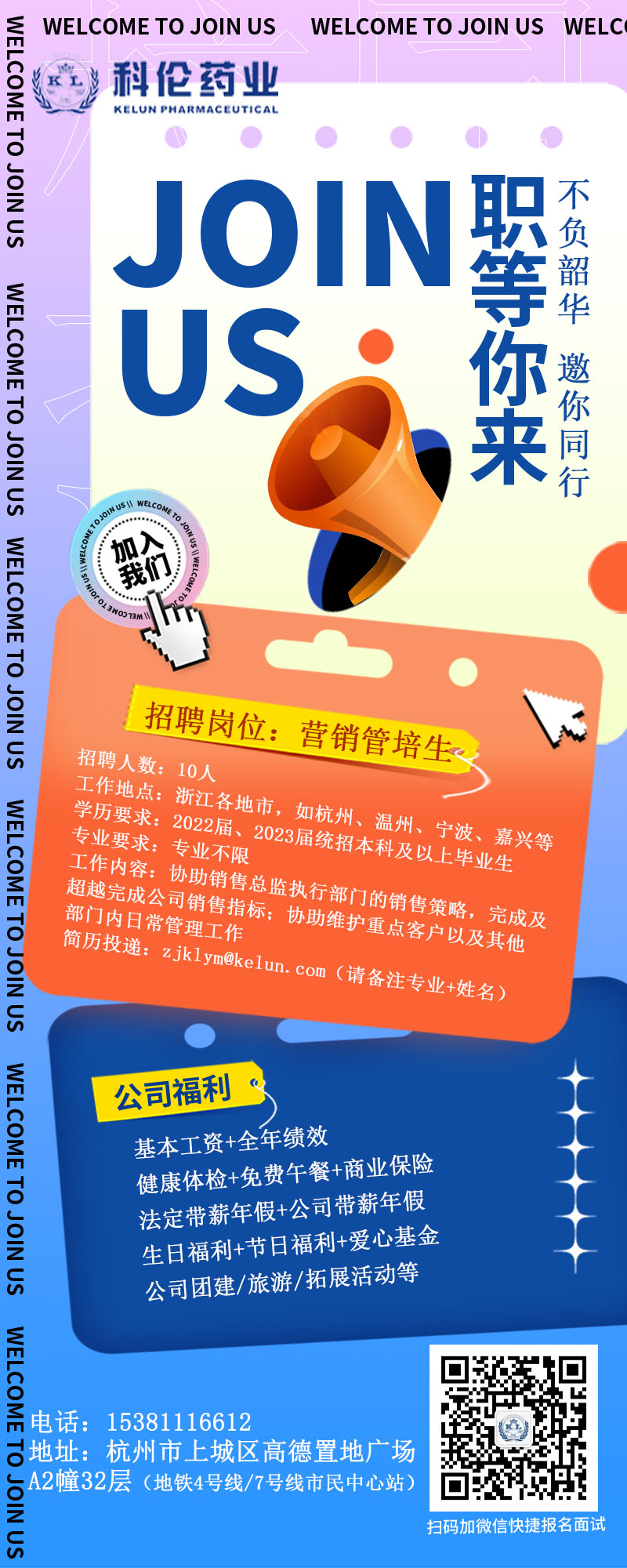 浙江科伦医药贸易有限公司,创立于 2017 年,位于杭州钱江新城核心区块,是四川科伦药业股份有限公司(股票代码:SZ002422)的全资子 公司。主要承接科伦产品在浙江省内销售。公司设有杭州营销中心和丽水物流中心,在销产品广泛覆盖基础输液、营养输液、抗感染类、镇痛麻醉 类、肿瘤类、精神类、抗骨质疏松类、心脑血管类、泌尿男科类等领域。公司现拥有一支富有经验、团结协作、管理严格、敢于打拼的专业化销售推广团队,部署在浙江省各地市。浙江科伦医贸真诚欢迎有想法、有 热情、肯努力的你!注册地址:浙江省丽水龙泉市科伦大道工业园区炉田工业区科伦大道 9 号 公司地址:浙江省杭州市上城区高德置地广场 A2 幢 32 层(4 号线/7 号线 市民中心站)招聘岗位 人数 专业 工作地点 待遇营销管培生 10 面向2022-2023 届毕业生, 医学、药学、市场营销、中药学、护理学、 制药工程、生物工程等相关专业 浙江省各地市 以杭州市为主 6000-8000◎薪酬待遇:公司提供具有市场竞争力的薪酬;◎就业补贴:杭州引进老员工,生活补贴:一次性发放,本科 1 万元、硕士 3 万元;◎六险一金:入职缴纳养老、医疗、失业、工伤、生育保险及住房公积金,补充商业保险;◎带薪年休假:工作满一年即可享受带薪年休假,春节额外公司带薪假 5 天;◎员工关怀:健康体检、生日礼品、节日礼金、结婚贺喜、生育贺喜、继续再教育奖励、爱心基金等;◎培训和发展通道:完整的人才培养体系,科伦线上公司/专业培训/外部培训+三-六个月培养期+职级发展。联系人:刘老师实习/求职咨询:18351162832 (微信同号)投递邮箱:zhangxin@kelun.com扫码联系我们另请关注【科伦药业招聘】 公众号获取更多求职信息!