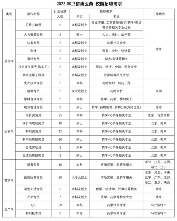 移动端:关注“卫信康招聘”公众号,进入校园招聘栏目,查看职位详情并投递简历