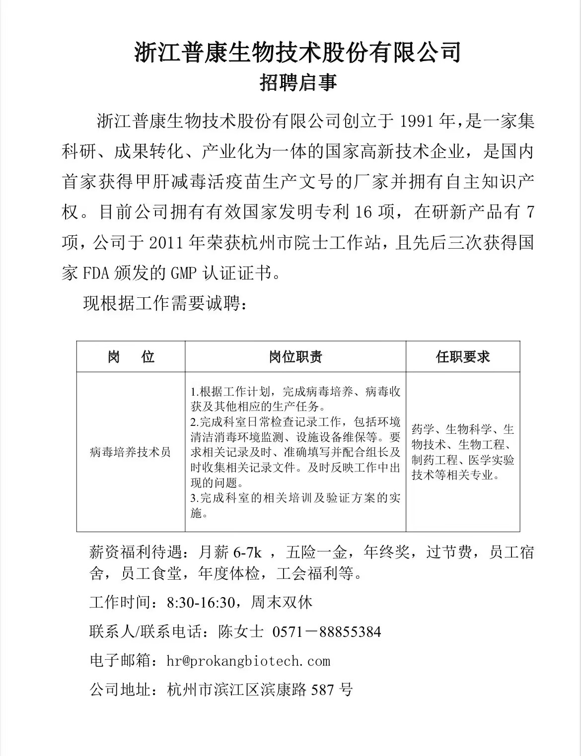 浙江普康生物技术股份有限公司招聘2023