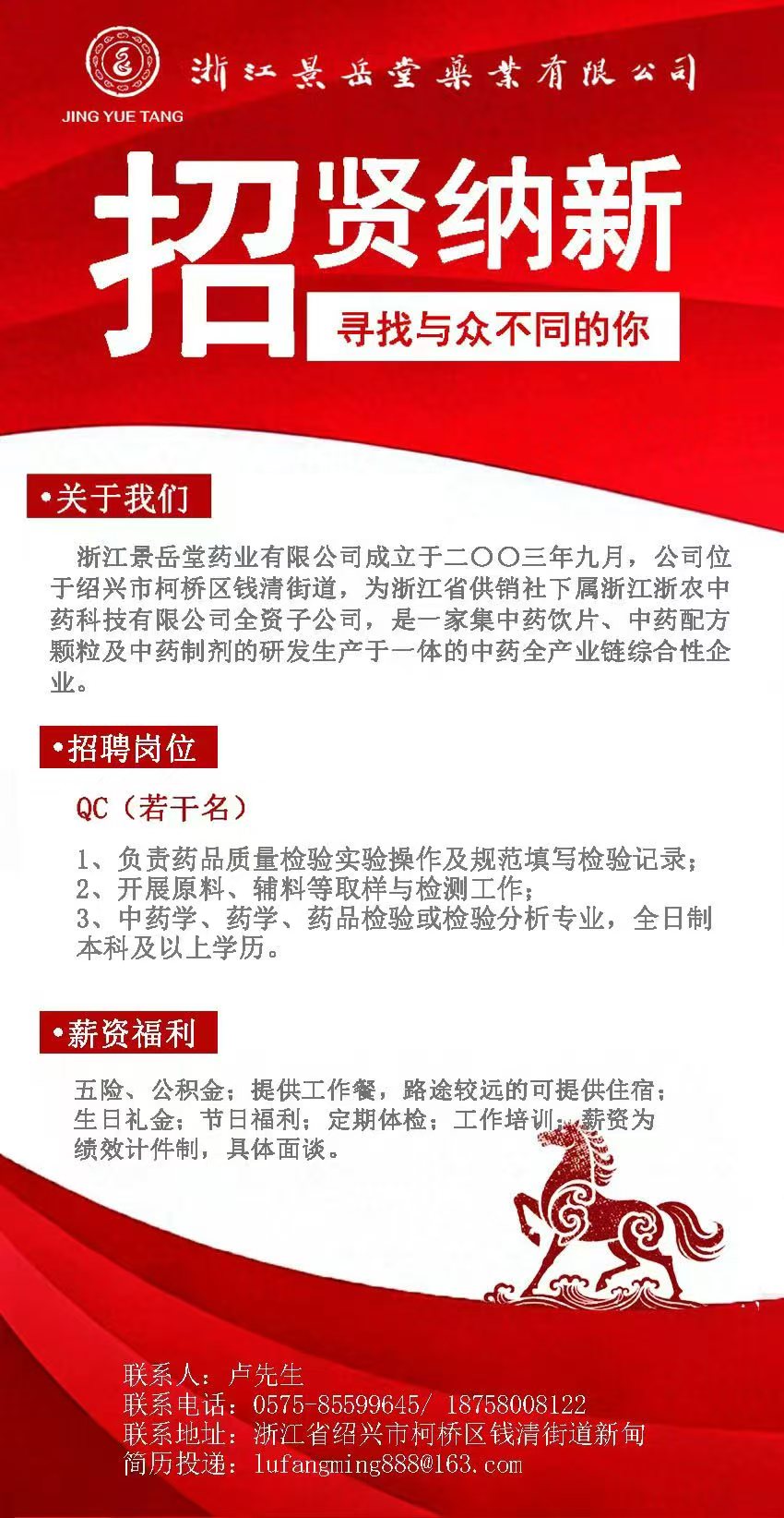 【暖心送岗】浙江景岳堂药业有限公司QC招聘
