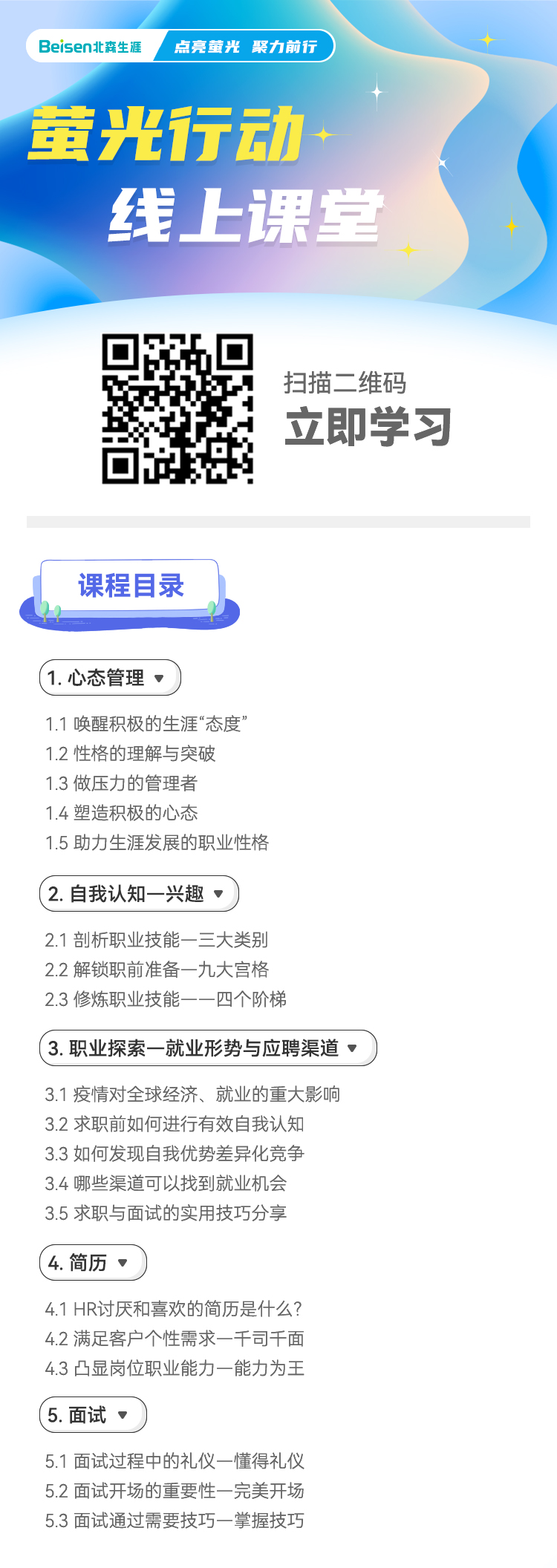 新竹就业指导工作室联合北森生涯,推出了荧光行动线上课程,助力探索生涯,求职应聘,欢迎同学们扫码学习。