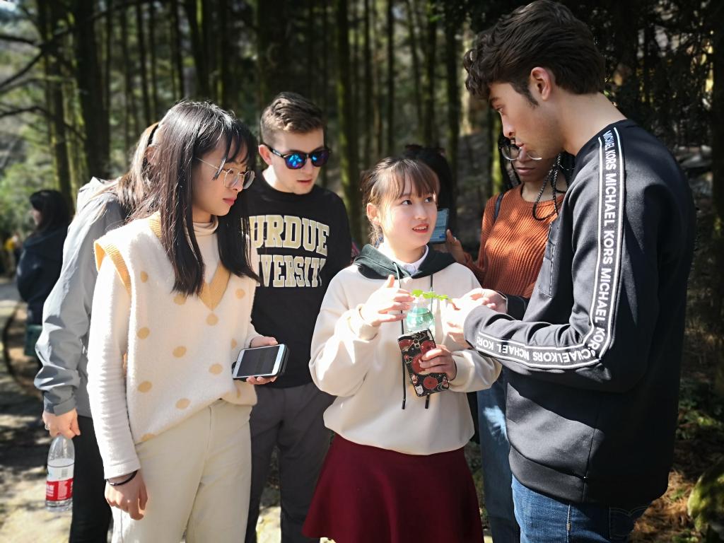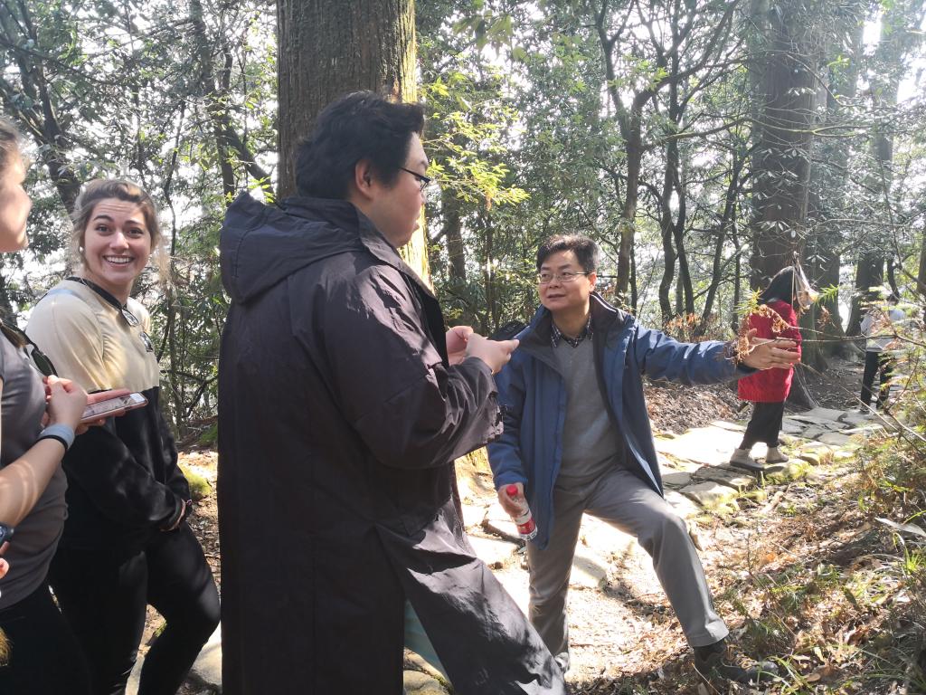 在杭州临安市天目山景区,中美师生无不感叹大自然的魅力,大家听着导游的介绍,对这里更显向往。公司同学们向普渡大学师生介绍植物的中文名字以及中文发音,友谊更近一步。在山间路上,石森林老师为中美员工们介绍药用植物,讲解相应的中药功效。在天目山顶,林敏同学为美国员工展示太极拳,并进行简单教学,以太极魅力展现中国文化之精深。紧接着,美国员工分成四组,每组由公司两位同学带领,识认天目山的植物。公司同学们将植物的英文名、中文名、拉丁名以及中药功效细细道来。由于文字含义等因素,美国同学对中药功效具体意义有所不解,但公司同学们用英文,结合通俗有趣的叙述,使大家在欢声笑语中熟悉了各类中草药。天目山路途崎岖,中美员工互相搀扶帮助,是友谊的再一次升华。