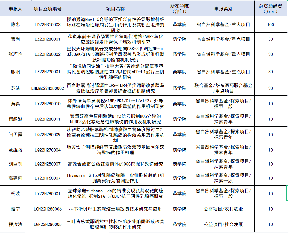 陈忠教授主持的《慢钠通道Nav1.6介导的下托兴奋性谷氨酸能神经环路在难治性癫痫发生中的作用及其新型阻滞剂研究》获批重大项目,实现了公司省自然科学基金重大项目零的突破。曹岗研究员主持的《盐炙车前子调节肠源性色氨酸代谢物/AHR/氧化应激途径发挥肾保护增效机制研究》、熊阳教授主持的《“微境协同论治”指导大黄/黄连组分配伍重塑脂代谢调控脂肪源性CCL2以协同aPD-L1治疗三阴性乳腺癌的研究》、张巧艳教授主持的《巴戟天环烯醚萜苷类成分靶向GSK-3β调控NF-κB和JAK/STAT3通路抑制类风湿关节炎成纤维样滑膜细胞功能的机制研究》和苏洁老师主持的《百令胶囊通过肠源性LPS-TLR4炎症通路改善胰岛素抵抗治疗多囊卵巢综合征的机制研究》获批重点项目,使公司重点项目立项数取得了历史性突破。